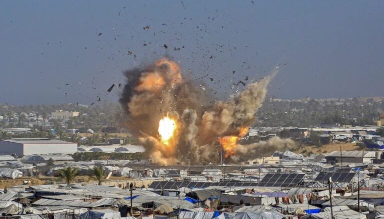 Καπνός και φωτιά υψώνονται από το καταφύγιο Γκαθ, όπου στεγάζονται εκτοπισμένοι Παλαιστίνιοι, μετά από ισραηλινή αεροπορική επιδρομή στα δυτικά του Χαν Γιουνίς, στη νότια Λωρίδα της Γάζας, στις 31 Ιανουαρίου 2026. (Photo by Bashar Taleb / AFP)