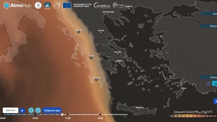 Μπορείτε να παρακολουθείτε την πρόγνωση και την εξέλιξη του φαινομένου, σύμφωνα με τα δεδομένα της Υπηρεσίας για την Παρακολούθηση της Ατμόσφαιρας CAMS στο διαδικτυακό portal του AtmoHub: https://portal.atmohub.gr/erimiki-skoni