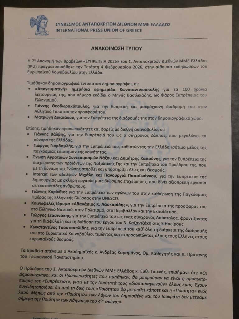 Αθήνα.- Στην Αίθουσα εκδηλώσεων του Ευρωπαίκού Κοινοβουλίου στην Ελλάδα πραγματοποιήθηκε το απόγευμα της Τετάρτης 4 Φεβρουαρίου 2026 η 7 η Απονομή των βραβείων “ΕΥΠΡΕΠΕΙΑ 2025″ από τον Σύνδεσμο Ανταποκριτών Διεθνών ΜΜΕ Ελλάδος και τον πρόεδρό του Θύμιο Τσικνή. Τα βραβεία απέμεινε ο Ακαδημαίκός Ανδρέας Καραμάνος.