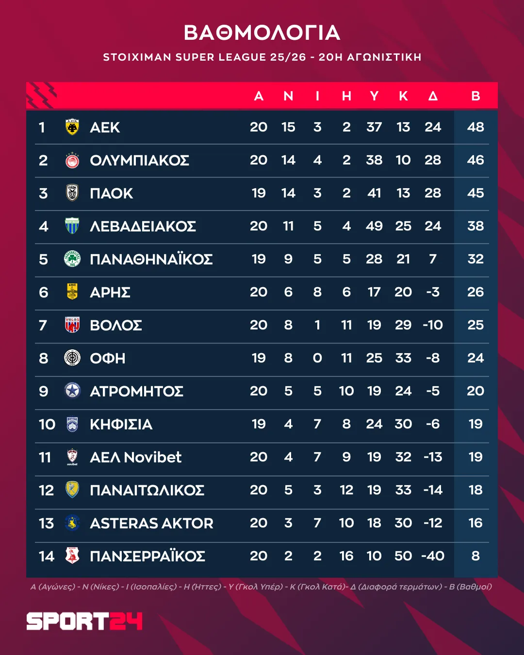 Ολυμπιακός – Παναθηναϊκός 0-1 / Βαθμολογία – (Ολοκληρωμένο)