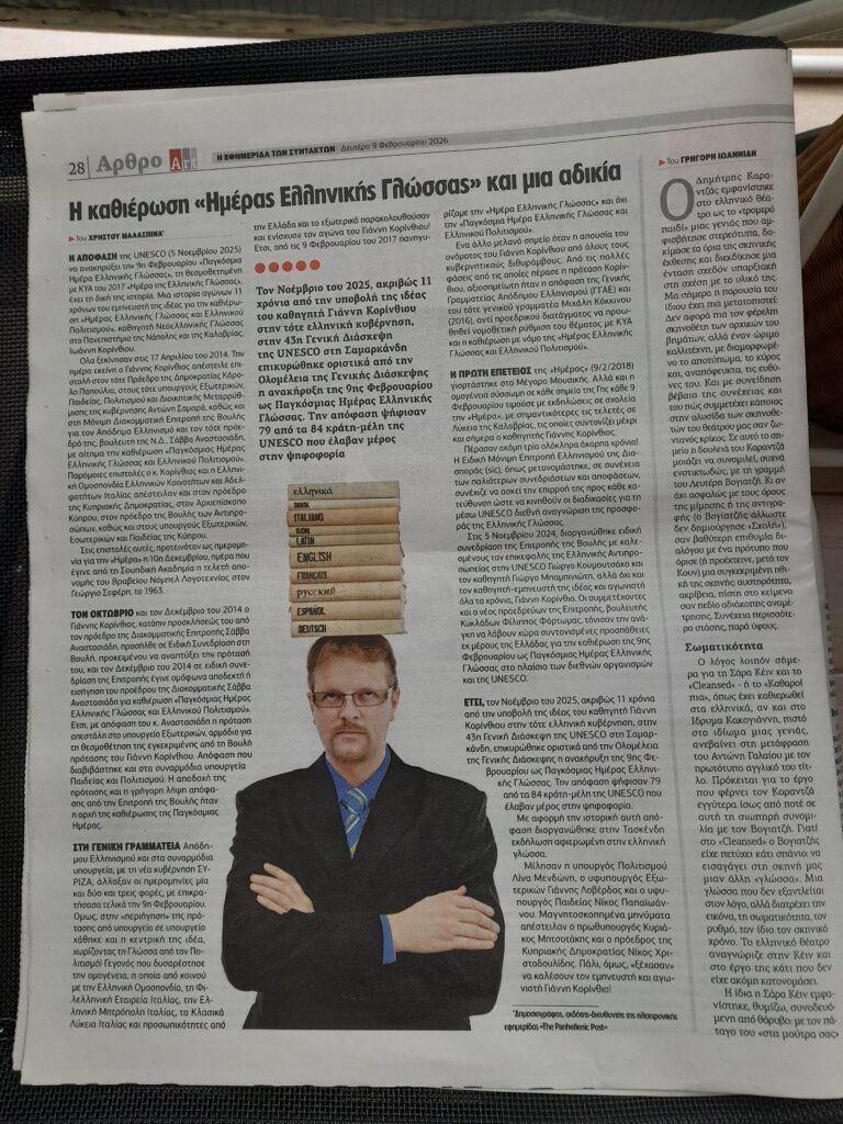 Την Δευτέρα 9 Νοεμβρίου 2026, για πρώτη φορά Ημέρα εορτασμού της Παγκόσμιας Ημέρας Ελληνικής Γλώσσας μετά την πρόσφατη αναγνώρισή της από την UNESCO, στην Εφημερίδα των Συντακτών δημοσιεύθηκε σχετικό άρθρο του Εκδότη της PANHELLENIC POST, Χρήστου Μαλασπίνα.
