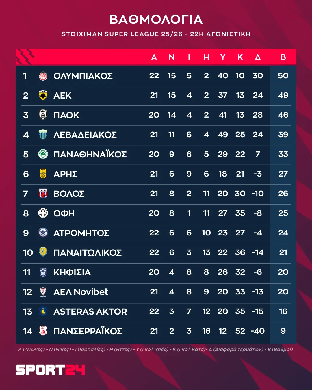Το πρόγραμμα και τα αποτελέσματα της 22ης αγωνιστικής
