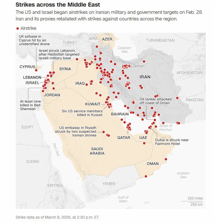 Ο χάρτης των επιθέσεων στη Μέση Ανατολή έως τις 8 Μαρτίου/ Πηγή:CNN