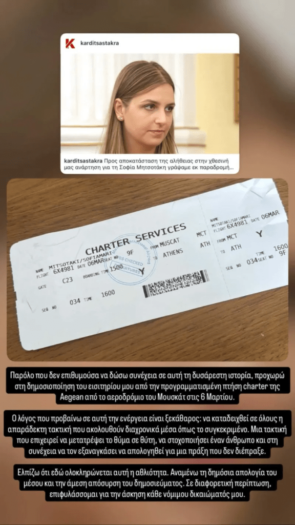 Η κόρη του πρωθυπουργού διευκρίνισε πως επέλεξε να δώσει στη δημοσιότητα το εισιτήριο της πτήσης charter της Aegean για να τερματίσει την παραπληροφόρηση. Κατήγγειλε τη στοχοποίησή της από συγκεκριμένο Μέσο, κάνοντας λόγο για «απαράδεκτες πρακτικές» που αντιστρέφουν την πραγματικότητα.