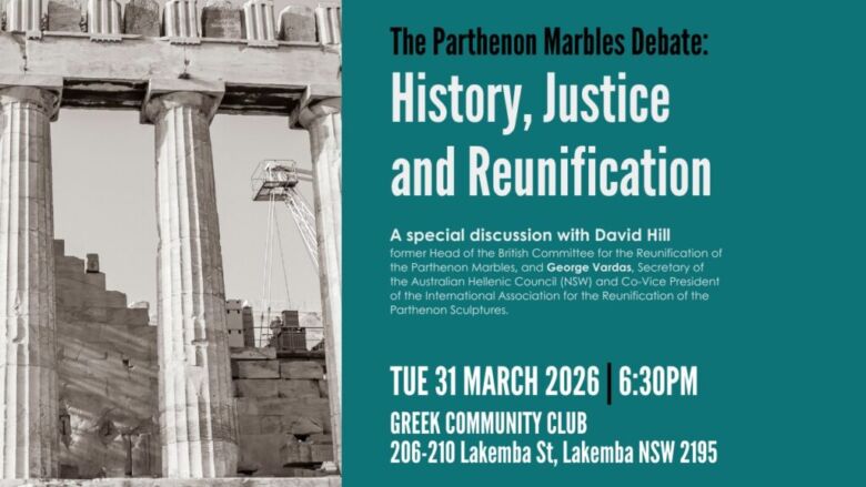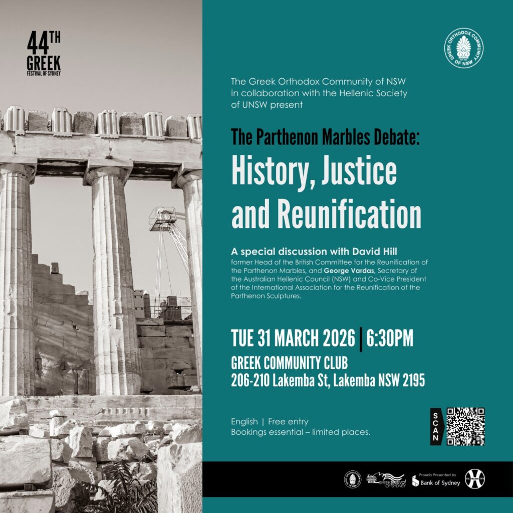 Hear from David Hill, former Head of the British Committee for the Reunification of the Parthenon Marbles, who has campaigned for decades for the return of the sculptures to Athens. He will be joined by George Vardas, Secretary of the Australian Hellenic Council (NSW) and Co-Vice President of the International Association for the Reunification of the Parthenon Sculptures.