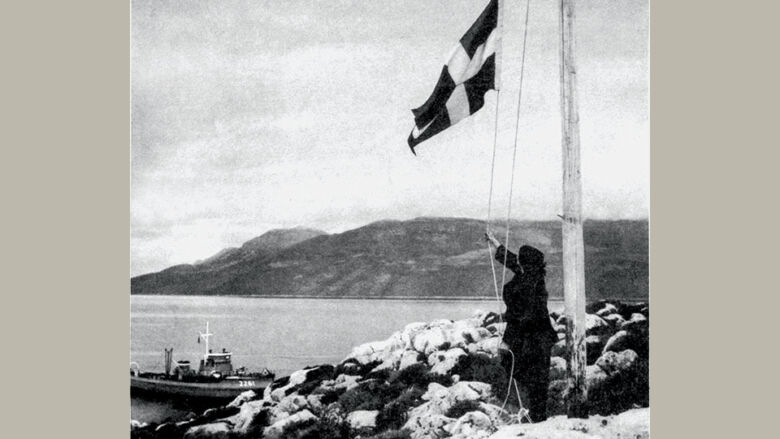 Η Δέσποινα Αχλαδιώτη εγκαταστάθηκε στη Ρω το 1924 μαζί με τον σύζυγό της και τη μητέρα της. Κατά την περίοδο της Κατοχής συμμετείχε στην Αντίσταση και παρέμεινε στο νησί μέχρι το τέλος της ζωής της. Η εικόνα της —μόνης, πάνω στον βράχο, με τη σημαία— πέρασε στη συλλογική συνείδηση ως κάτι μεγαλύτερο από μια καθημερινή πράξη. Έγινε σύμβολο.