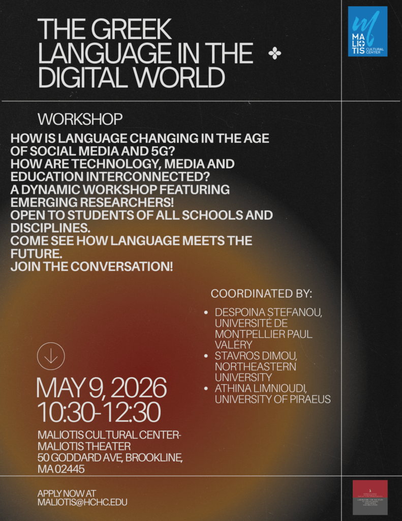 Ένα κορυφαίο ακαδημαϊκό γεγονός που αναδεικνύει τον ρόλο της ελληνικής γλώσσας στη νέα ψηφιακή, κοινωνική και γεωπολιτική πραγματικότητα οργανώνει το Maliotis Cultural Center of Hellenic College Holy Cross σε συνεργασία με τη Μονάδα «Ελληνική Γλώσσα, Πολιτισμός και ΜΜΕ» του Εργαστηρίου Μελέτης Κοινωνικών Θεμάτων, Μέσων Ενημέρωσης και Εκπαίδευσης του Παιδαγωγικού Τμήματος Νηπιαγωγών της Σχολής Επιστημών Αγωγής του Πανεπιστημίου Ιωαννίνων. Πρόκειται για το Διεθνές Συμπόσιο με τίτλο «Η Ελληνική Γλώσσα online σε περιόδους κρίσης: Προκλήσεις & Προοπτικές», που θα πραγματοποιηθεί στις 8 και 9 Μαΐου, στο Brookline της Μασαχουσέτης με ταυτόχρονη διαδικτυακή μετάδοση.
