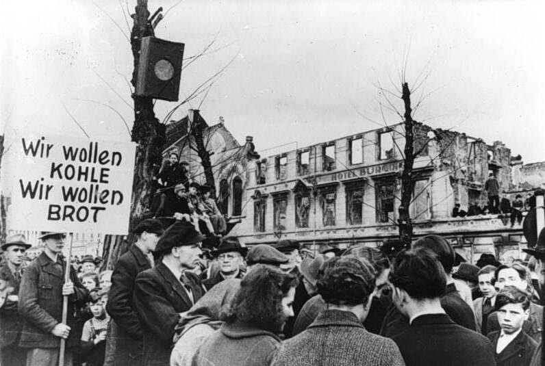 Ο χειμώνας της πείνας του 1947. Χιλιάδες διαδηλώνουν στη Δυτική Γερμανία ενάντια στην καταστροφική κατάσταση στον τομέα της διατροφής (31 Μαρτίου 1947). Το πλακάτ γράφει: Θέλουμε άνθρακα, θέλουμε ψωμί