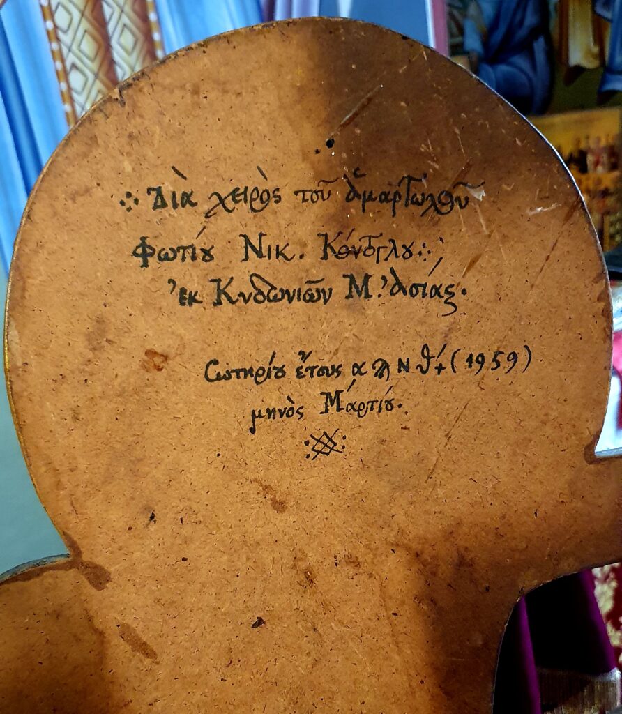 Η απόφαση αυτή αποτυπώνεται και στην αφιερωματική επιγραφή στο πίσω μέρος της εικόνας, στο ύψος της κεφαλής και του φωτοστέφανου: «Δια χειρός του αμαρτωλού Φωτίου Νικ. Κόντογλου εκ Κυδωνιών Μ. Ασίας αϡΝθ+(1959) μηνός Μαρτίου».