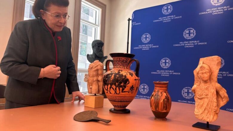 Σικάγο.– Η υπουργός Πολιτισμού Λίνα Μενδώνη παρέλαβε, σε ειδική τελετή, στο Γενικό Προξενείο της Ελλάδας, στο Σικάγο, πέντε αρχαιότητες, που επαναπατρίζονται από τις Ηνωμένες Πολιτείες. Όπως αναφέρει ανακοίνωση του ΥΠΠΟ, πρόκειται για δύο μελανόμορφα αγγεία (αμφορέα και όλπη) αττικών εργαστηρίων του 6ου αιώνα π.Χ. , ένα χάλκινο κάτοπτρο της Ύστερης Αρχαϊκής-Κλασικής περιόδου, ένα ακέφαλο μαρμάρινο άγαλμα του Ερμή (1ος αι. π.Χ. – 1ος αι. μ.Χ.) και τμήμα αναγλύφου, με παράσταση της θεάς Αθηνάς, του 2ου αι. μ.Χ.
