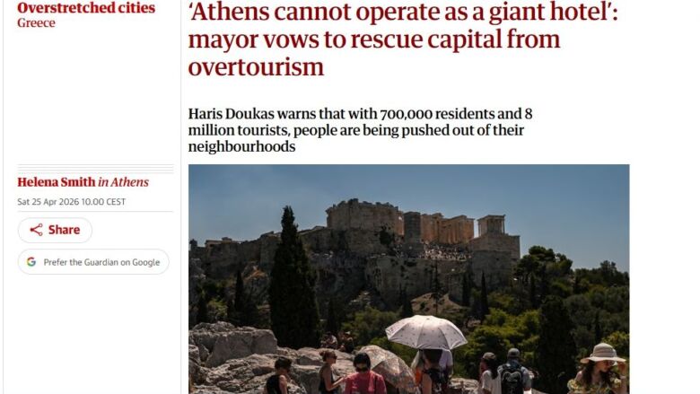 Ο βρετανικός The Guardian σε εκτενές άρθρο του στρέφει το βλέμμα στην Αθήνα, αναδεικνύοντας το οξύ πρόβλημα του υπερτουρισμού και τις πιέσεις που αυτός ασκεί στην καθημερινότητα των κατοίκων της πρωτεύουσας.
