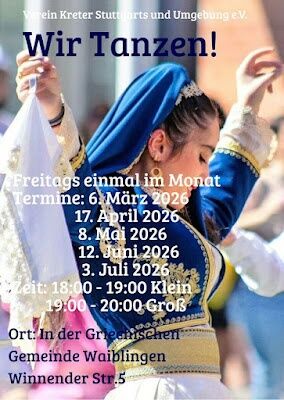 Ο Κρητικός Σύλλογος Στουτγάρδης και Περιχώρων ανακοινώνει με χαρά την έναρξη μαθημάτων κρητικών χορών, τα οποία πραγματοποιούνται στην αίθουσα της Ελληνικής Κοινότητας Waiblingen. Η πρωτοβουλία αυτή αποσκοπεί στη διατήρηση και διάδοση της κρητικής παράδοσης, φέρνοντας κοντά μέλη και φίλους του συλλόγου μέσα από τη μουσική και τον χορό.